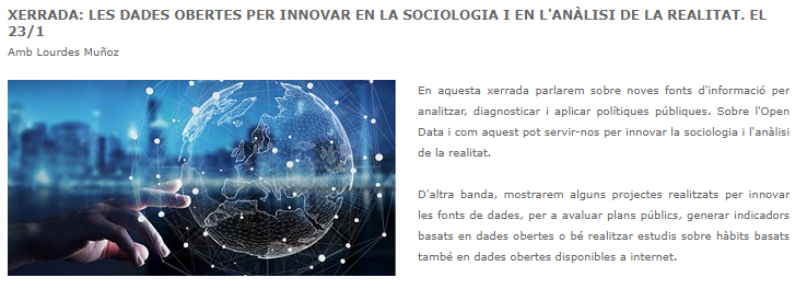 El passat dimecres 23 de Gener, la presidenta de Iniciativa Barcelona Open Data, Lourdes Muñoz, va presentar al Col·legi de Politòlegs i Sociòlegs de Catalunya les eines Open Data tot aprofitant l’estudi “Dades i centres esportius: L’encaix de la pràctica esportiva i la reforma horària” on ha participat Iniciativa Barcelona OPen Data, junt amb la Generalitat i la Diputació de Barcelona , aportant les dades al projecte global.