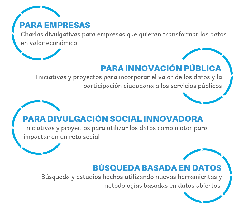 Serveis Solucions tecnològiquesLocalitzar dades obertes i crear visualitzacions de dades per que siguin fàcils d’interpretarper tal que qualsevol persona les pugui aplicar a la gestió de projectes.Informa’t Divulgació de dades obertesEsdeveniments de divulgació sobre dades obertes a la ciutadania per aconseguir la reutilització efectiva de dades i la seva transformació en valor per la societat.Informa’t Esdeveniments innovadorsOrganitzem tot el procés per reunir perfils multidisciplinars amb una metodologia innovadora i aconseguim, en poques hores, localitzar dades obertes amb valor a l’entorn d’una temàtica.Informa’t Open Data LabEspai de divulgació, formació i promoció de l’emprenedoria basada en dades per a generar oportunitats professionals a partir de les dades obertes.Informa’t Dades x Comerç Kit DigitalEina digital per a posar a l’abast del comerç de proximitat, recursos (dades obertes) per a prendre decisions de negoci.Informa’t FormacióCapacitar a la ciutadania i organitzacions en les competències bàsiques del maneig de les dades obertes per a les noves oportunitats professionals.Informa’t