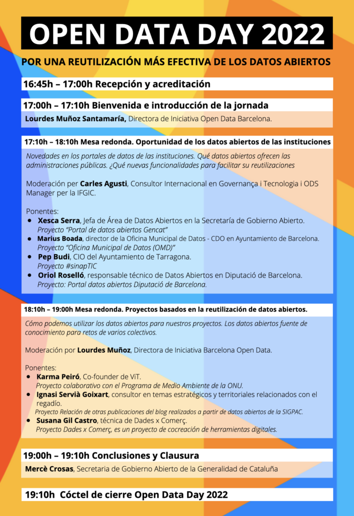 El 9 de marzo de 2020 celebramos el último Open Data Day presencial, queremos retomar con fuerza la actividad divulgativa sobre los Datos Abiertos con celebración próximo 9 de marzo del Open Data Day 2022 en Barcelona, después de las restricciones del COVID19 de los últimos meses .