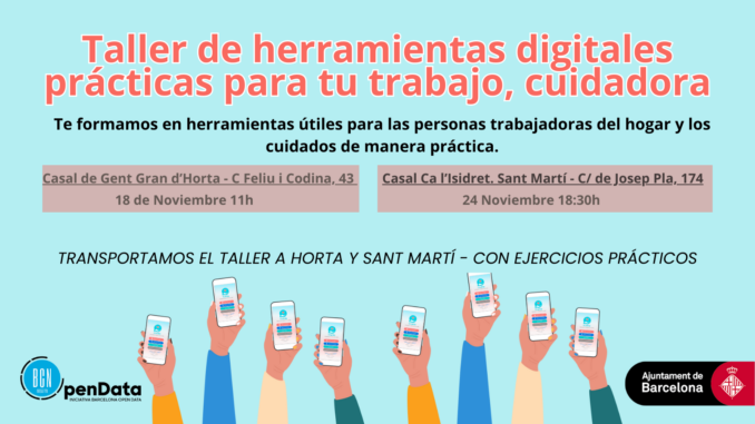 iCuida trae el taller “Herramientas prácticas para tu trabajo, cuidadora” a los distritos de Horta y Sant Martí. El sábado 18 de noviembre estaremos en el Casal Casal de Gent Gran d’Horta (Feliu i Codina, 37) y el viernes 24 de noviembre en el Casal Ca l’Isidret (Josep Pla, 174).